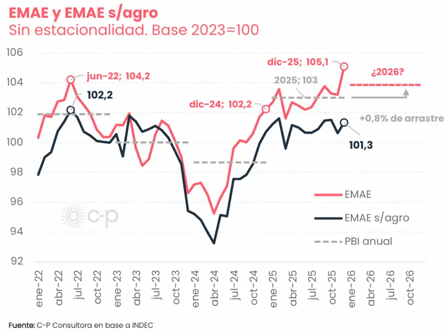 En esa línea, la economía argentina creció el año pasado (EMAE-INDEC: +4,4% promedio anual), pero ese crecimiento fue desigual y con bases débiles. ¿Cómo cerró 2025? Más del 80% del crecimiento (3,6 puntos) se explicó por el arrastre estadístico de 2024, no por un dinamismo propio del año. De hecho, el crecimiento “genuino” del año fue muy bajo (0,8 puntos), en un escenario donde la actividad tuvo un sendero muy irregular, con caídas en varios momentos y rebote recién al final.